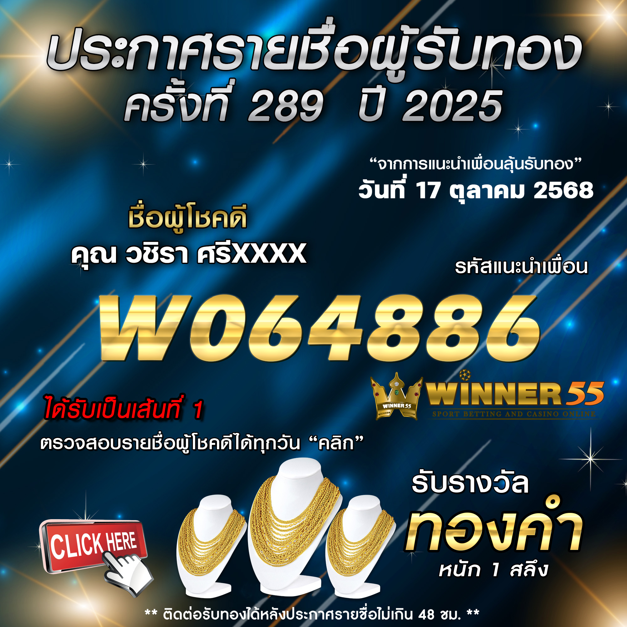 ประกาศรายชื่อผู้โชคดี วชิรา ศรีxxxx ได้รับทองคำหนัก 1 สลึง ประจำวันที่ 17 ตุลาคม 2568 17/10/2025