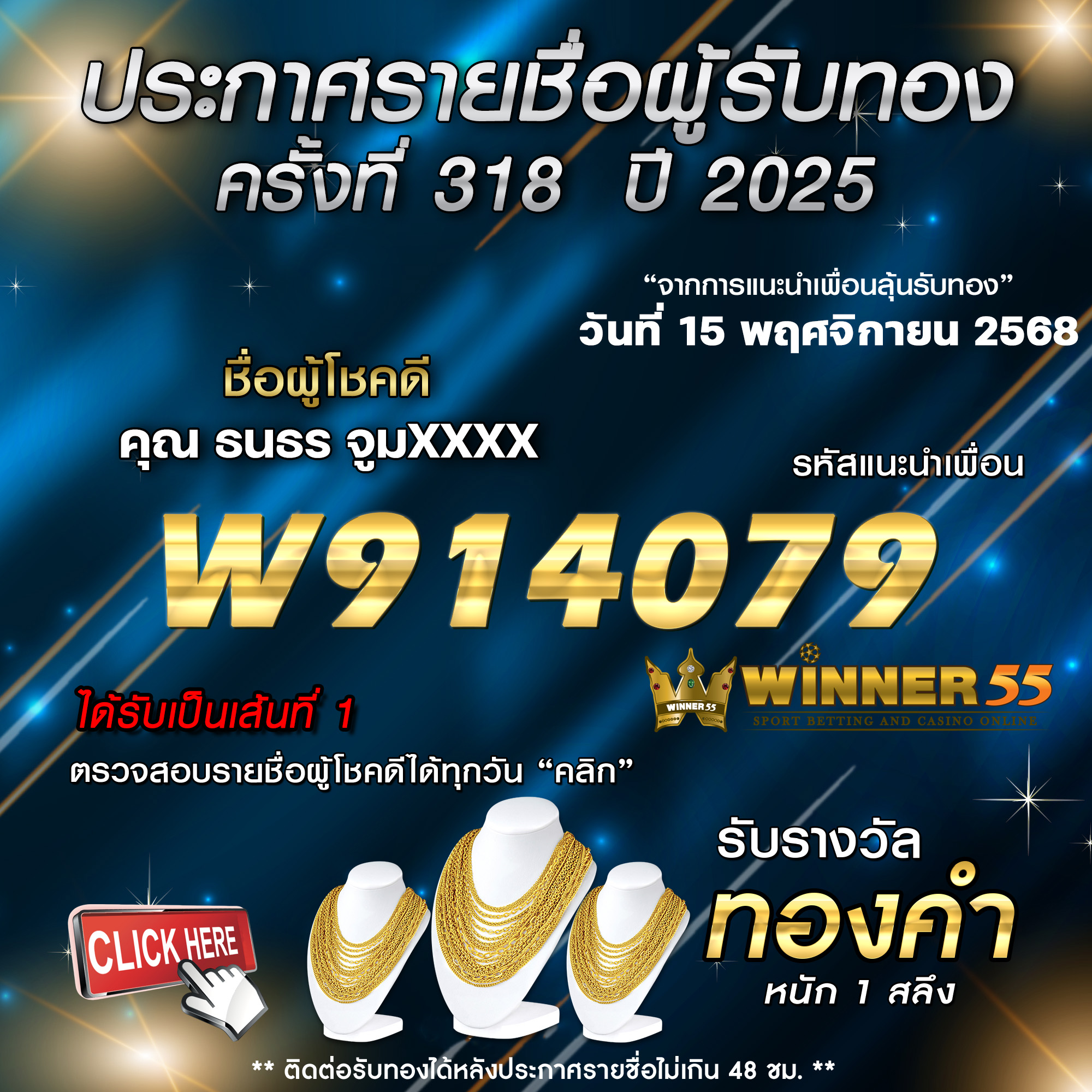 ประกาศรายชื่อผู้โชคดี ธนธร จูมxxxx ได้รับทองคำหนัก 1 สลึง ประจำวันที่ 15 พฤศจิกายน 2568