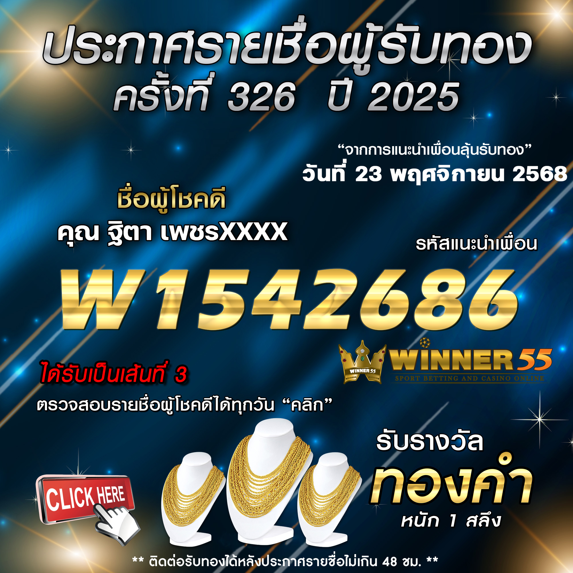 ประกาศรายชื่อผู้โชคดี ฐิตา เพชรxxxx ได้รับทองคำหนัก 1 สลึง ประจำวันที่ 23 พฤศจิกายน 2568