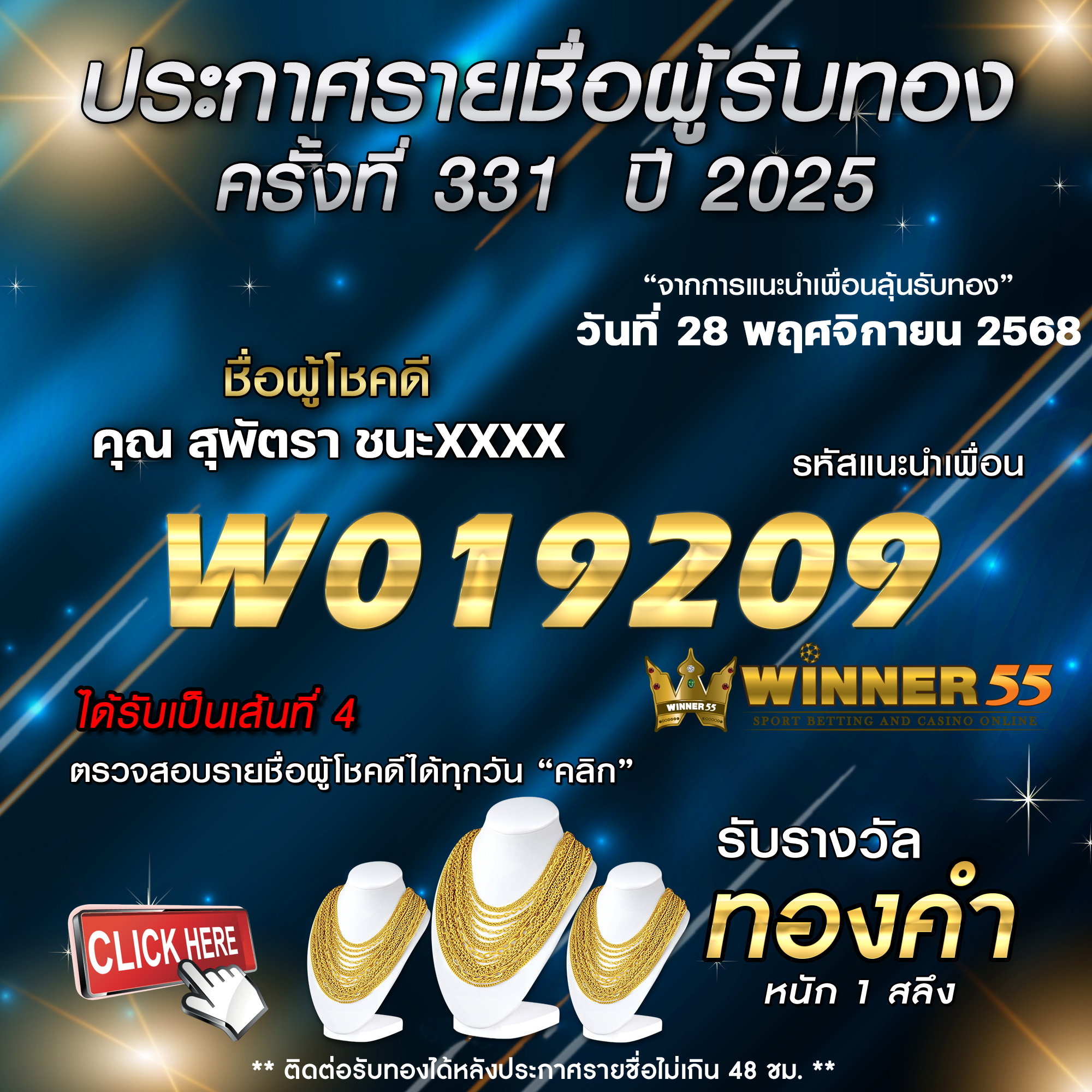 ประกาศรายชื่อผู้โชคดี สุพัตรา ชนะxxxx ได้รับทองคำหนัก 1 สลึง ประจำวันที่ 28 พฤศจิกายน 2568